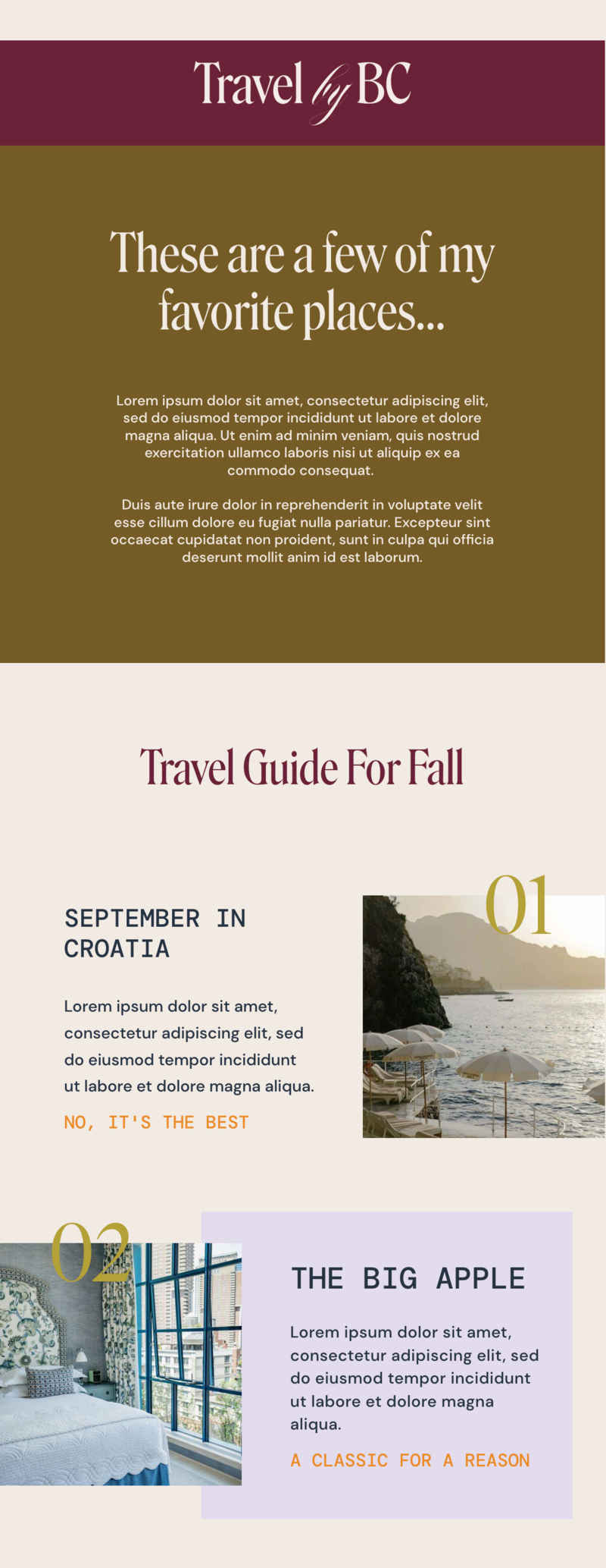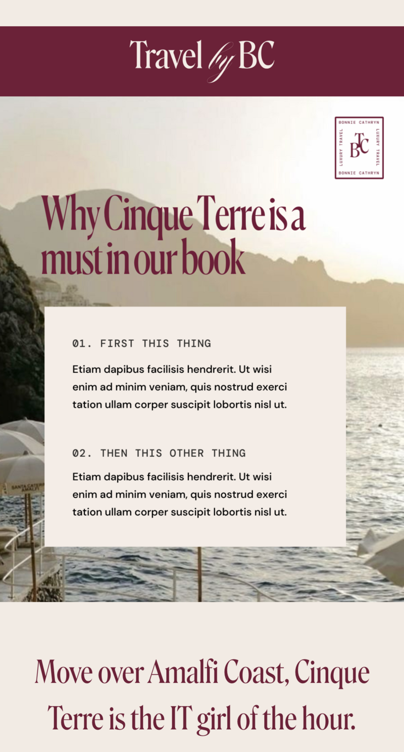 Travel by BC is a boutique travel planning studio curating bespoke itineraries for luxury and adventure travelers. The founder wanted a brand that felt both aspirational and personal — evoking the anticipation of a new destination while maintaining the polish of a high-end service experience.